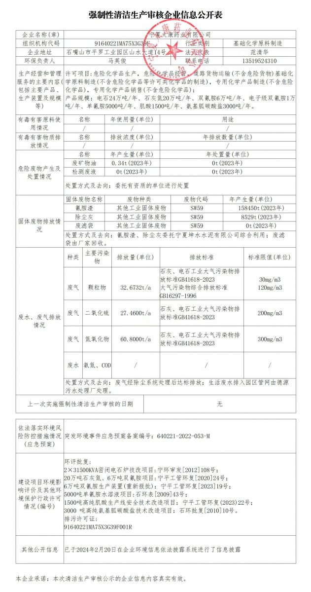 根據《自治區(qū)生態(tài)環(huán)境廳、發(fā)展和改革委員會關于公布 2024 年開展強制性清潔生產審核重點企業(yè)名單的通知》(寧環(huán)發(fā)〔2024〕39 號)文件,公司被納入自治區(qū) 2024 年開展強制性清潔生產審核重點企業(yè),現將公司相關信息公開公布。